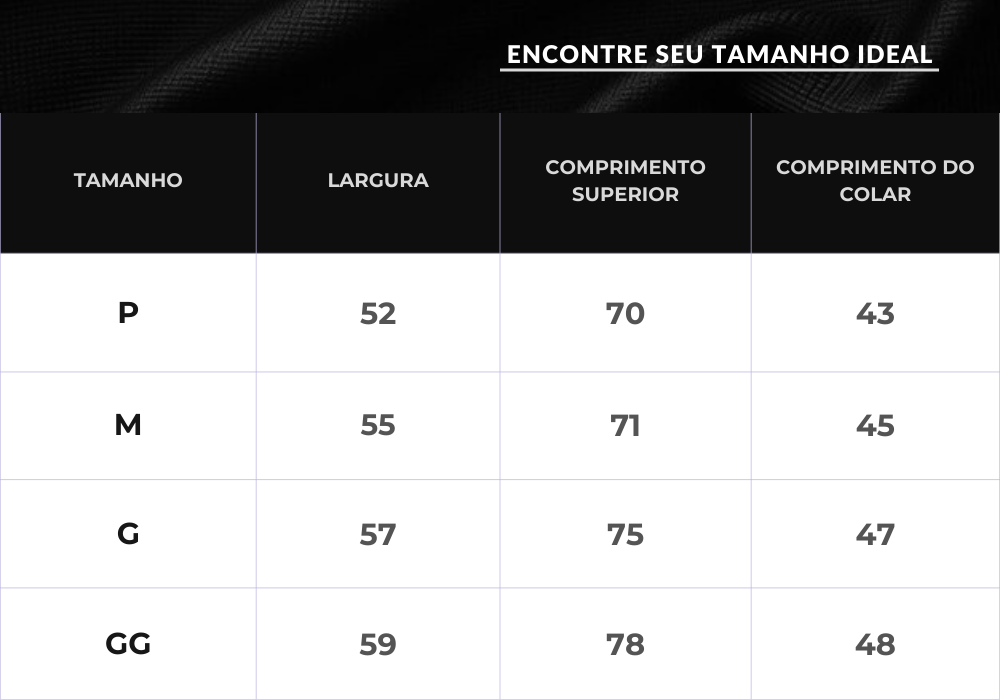 MEDIDAS: Tamanho Brasileiro (cm) Busto Ombro Comprimento P 100 42 69 M 104 43 70 G 107 44 72 GG 111 45 74 *Pode haver variação de 01 a 02 cm.